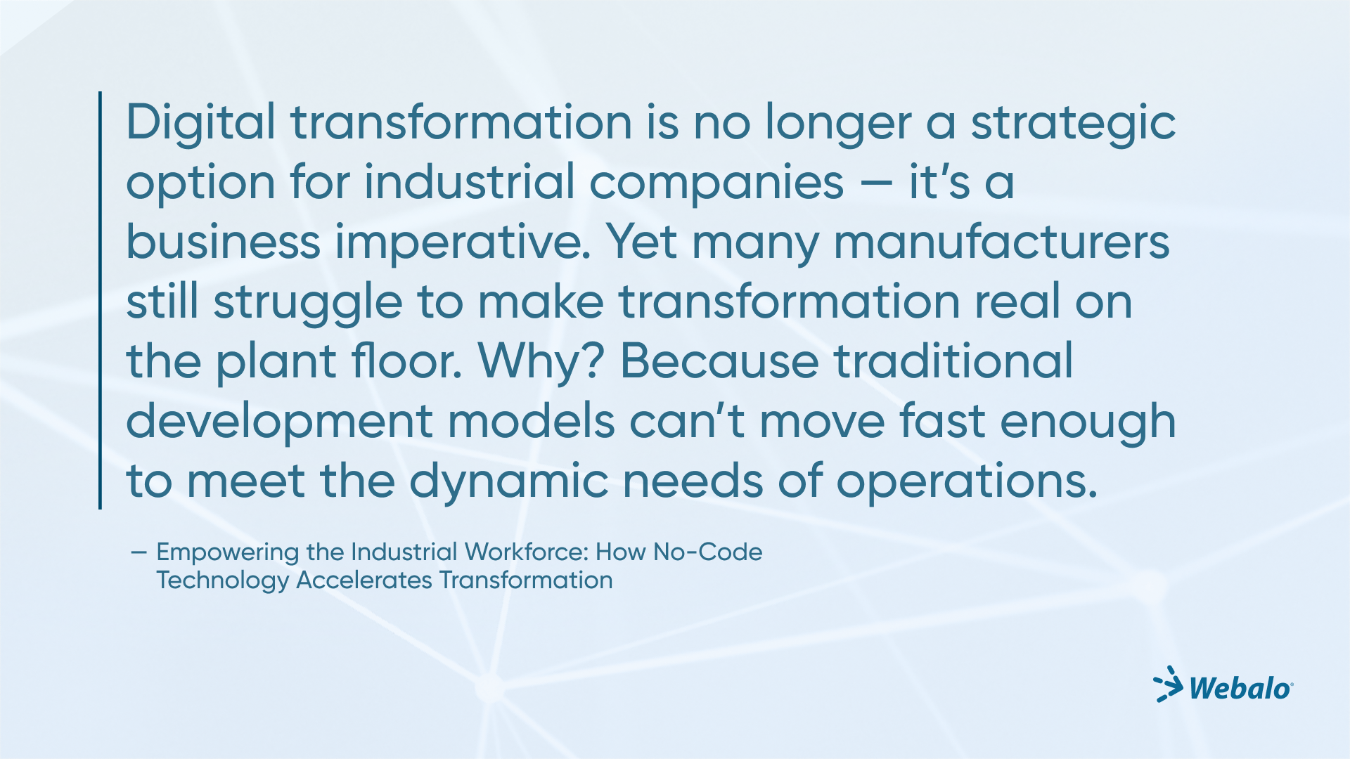 Digital transformation is no longer a strategic option for industrial companies — it’s a business imperative. Yet many manufacturers still struggle to make transformation real on the plant floor. Why? Because traditional development models can’t move fast enough to meet the dynamic needs of operations.